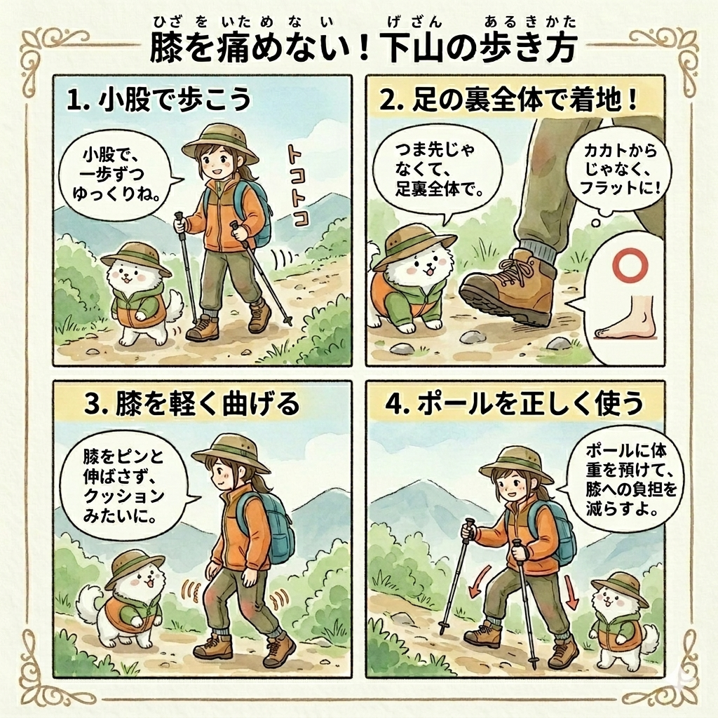 • ゆっくり下る 下り坂ではどうしてもスピードが出がちですが、意識的にゆっくり歩くことで筋肉の疲労を抑えられます。