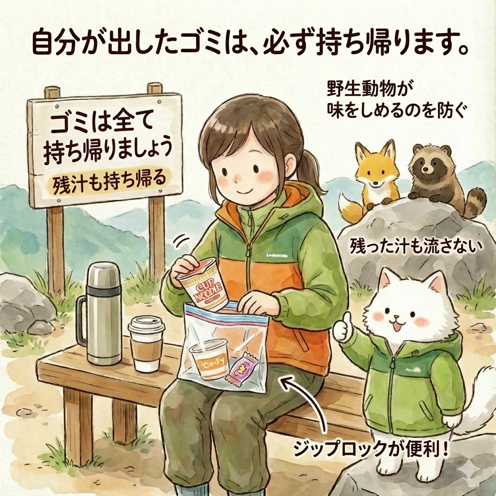頂上でカップラーメンを食べたり、コーヒーを飲むのも山あるきの醍醐味ですが、残った汁を流したりするのも厳禁です。