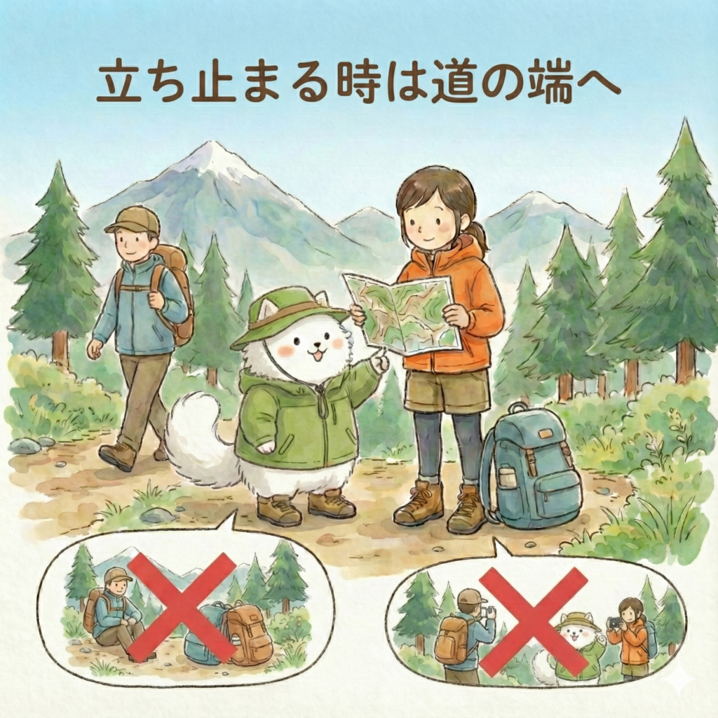道の真ん中で止まると、他の登山者の通行の妨げになり、接触や転落事故につながる恐れがあるからです。ザックを下ろして休む時は、少し広くなっているスペースを見つけましょう。