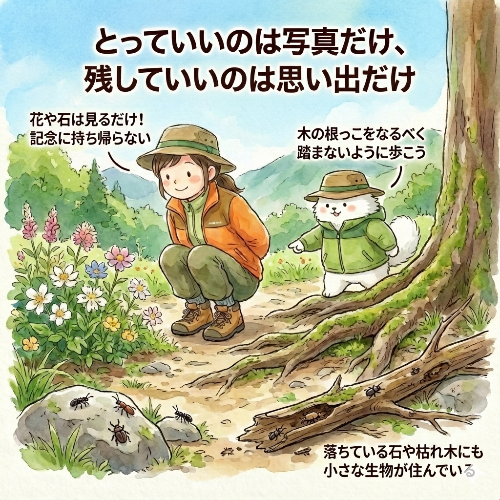 きれいな花が咲いていても見るだけにします。自然環境と生態系の保護のために、花や石などを記念に持ち帰るのはやめましょう。